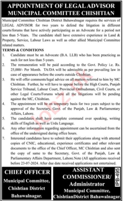 Latest Municipal Committee Legal Posts Chishtian 2025