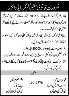 Municipal Committee Muzaffargarh, muzaffargarh Punjab Pakistan invites applications from eligible candidates for the post of legal advisor as per advertisement of April 27, 2025 published in daily Nawaiwaqt Newspaper. Preferred Education is LLb etc.
