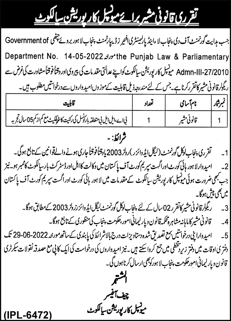 Latest Legal jobs and others Government jobs in Municipal Corporation closing date is around June 29, 2022, see exact from ad. Read complete ad online to know how to apply on latest Municipal Corporation job opportunities.