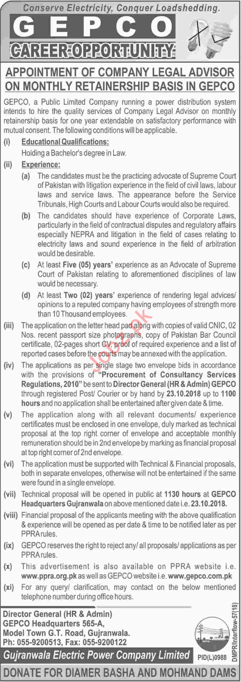 Vacancies in Gujranwala Electric Power Company Limited Advertisement October 2018
