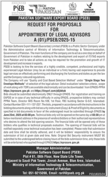 Pakistan Software Export Board PSEB Blue Area Islamabad, islamabad Islamabad Pakistan invites applications from eligible candidates for the post of legal advisor as per advertisement of May 31, 2025 published in daily The News Newspaper. Educational qualifications required LLb etc.