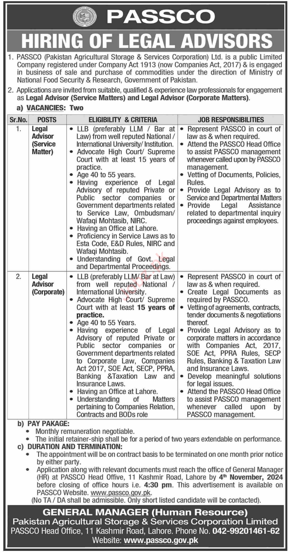 Pakistan Agricultural Storage & Services Corporation Limited PASSCO jobs advertisement dated about 20 October 2024 in daily Dawn Newspaper invites application for the vacant post of legal advisor corporate and legal advisor service matter in Lahore, lahore Punjab Pakistan. Candidates with LLb and LLM etc. educational background will be preferred.