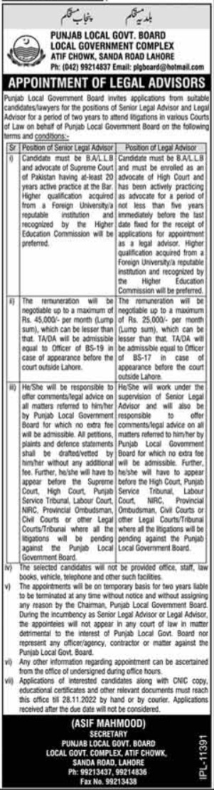 Legal Advisor Jobs At Punjab Local Government Board