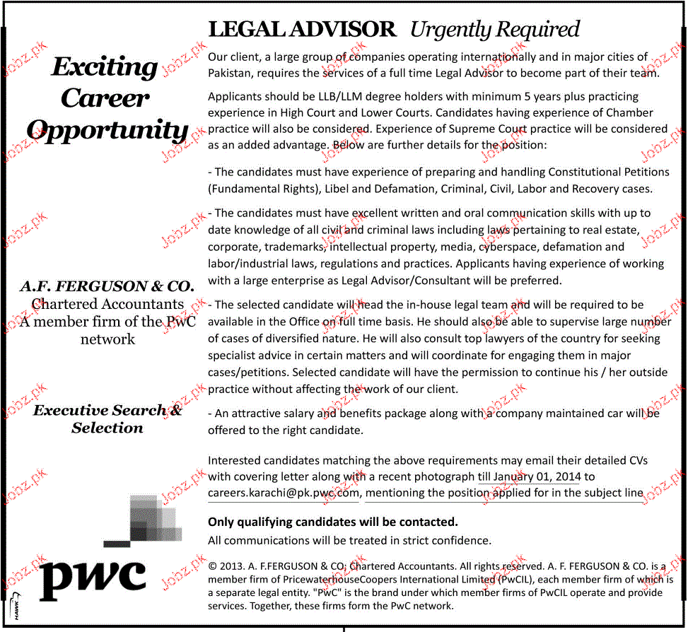 Apply as per details in job advertisement. Login to view further details of how to apply via https://www.jobz.pk online.