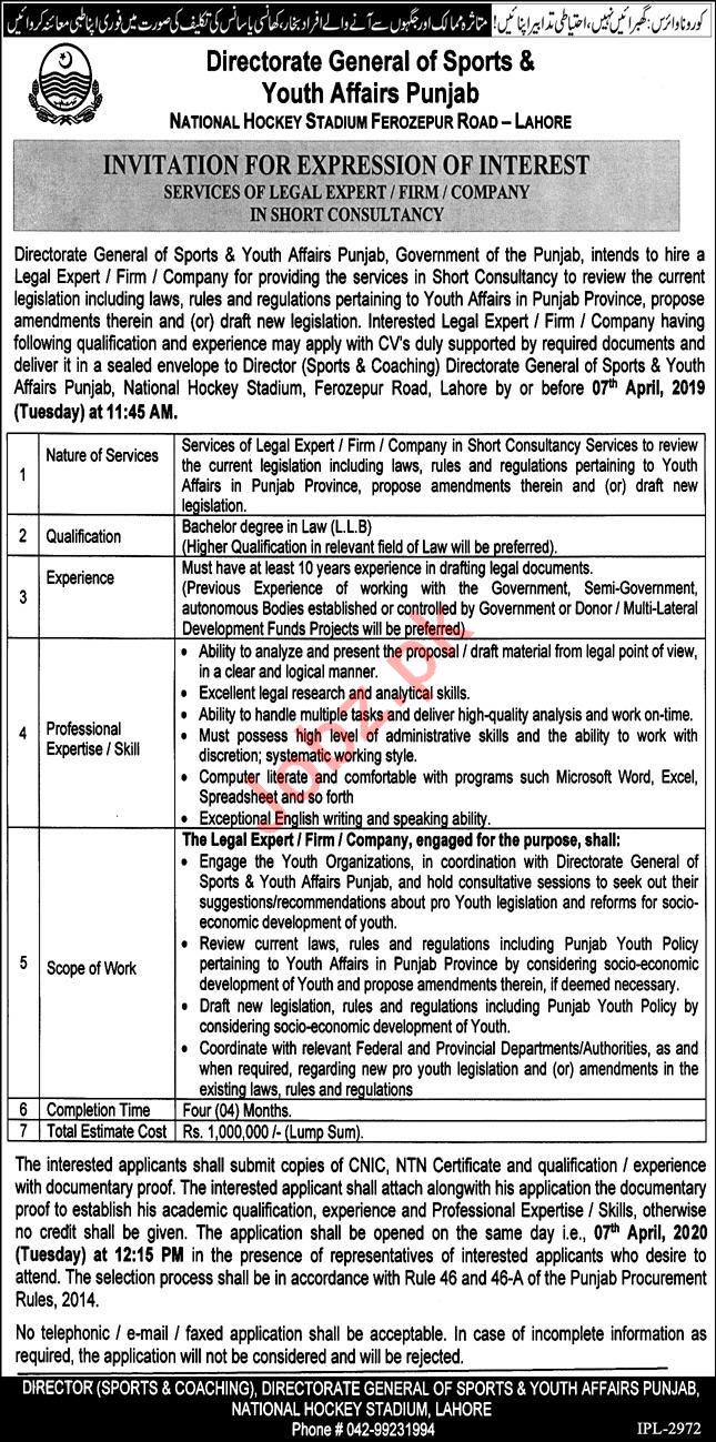 Latest Sports and Youth Affairs Department Legal Posts Lahore 2025