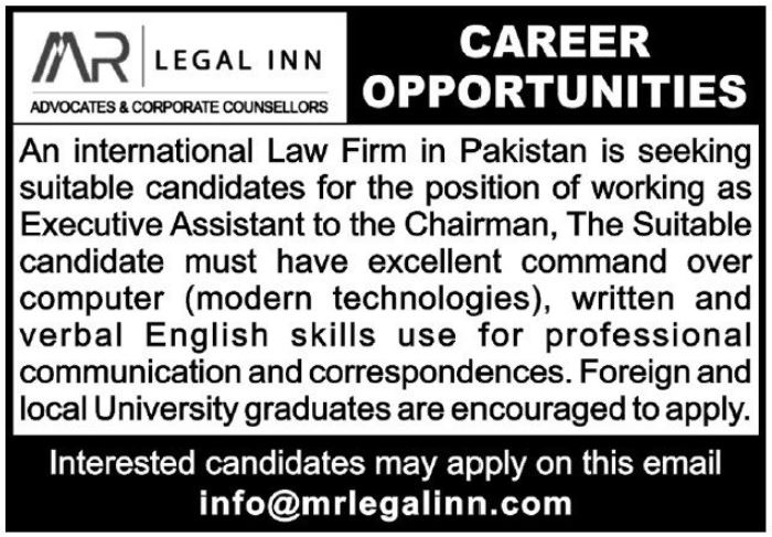 Vacant posts including executive assistant and executive assistant chairman are announced in MR Legal INN Karachi, karachi Sindh Pakistan as per 23 July 2023 advertisement in daily Express Tribune Newspaper. Bachelor and Master etc. educational qualification will be preferred.
