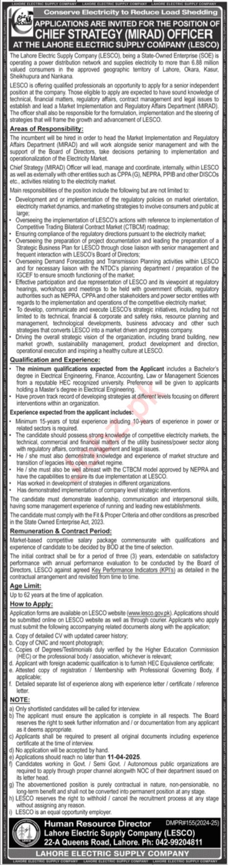 Lahore Electric Supply Company LESCO jobs advertisement dated about 24 March 2025 in daily Jang Newspaper invites application for the vacant post of chief strategy mirad officer in Queens Road Lahore, lahore Punjab Pakistan. Master, MS and Bachelor etc. educational qualification will be preferred.