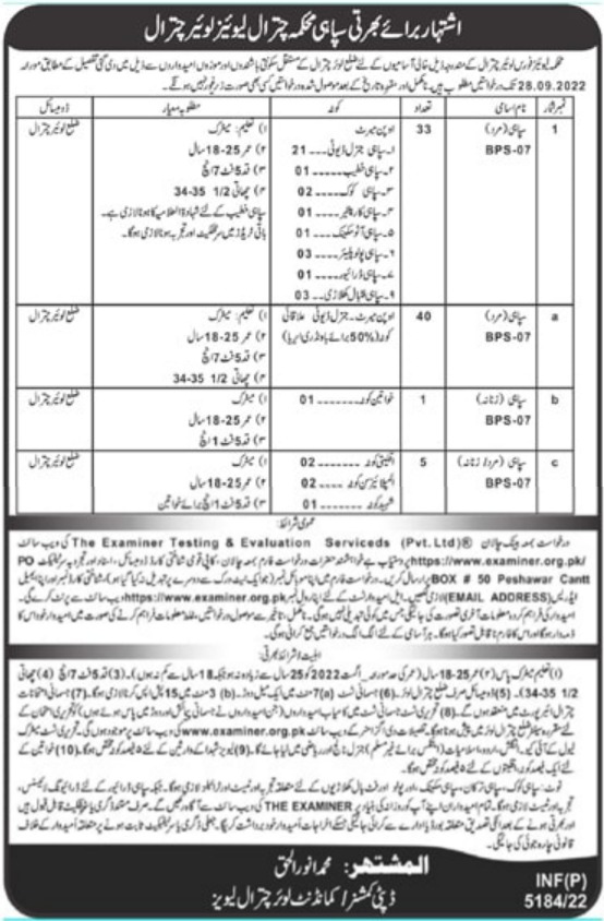 Levies Force latest Government Security jobs and others can be applied till September 28, 2022 or as per closing date in newspaper ad. Read complete ad online to know how to apply on latest Levies Force job opportunities.