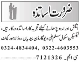 Lexicon School System invites applications for job positions advertised in daily Jang dated 3 September 2022 for following vacancies in Lahore, lahore Punjab Pakistan.