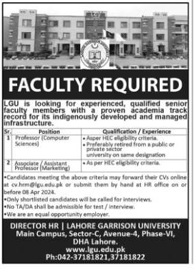 Lahore Garrison University is looking for candidates for following posts as per job advertisement published in daily Nation Newspaper of April 2, 2024 for location Lahore, lahore Punjab Pakistan: