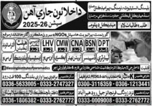 Blessing College of Nursing admissions 2025 for LHV, CMW has been announced. Students who want to take admissions in Blessing College of Nursing Lahore Punjab Pakistan for academic year 2025 to continue education in Science College can apply. Students for admissions in can apply for online or campus classes as per Government institute criteria till admission closing date. Read newspaper ad for exact details.
