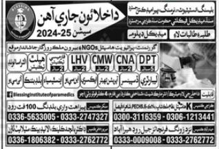 Blessing College of Nursing has announced admissions 2025 for LHV, CMW, CNA, DPT. Eligible students who qualify as per admission criteria in Blessing College of Nursing Sukkur Sindh Pakistan can apply in Medical College for academic year 2025. Students for admissions in & criteria can apply as per Private institute admission policy 2025 before closing date as per advertisement. Read newspaper ad for exact details.