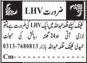Vacant posts including lady health visitor and lhv are announced in Hospital Clinic Quetta, quetta Balochistan Pakistan as per 25 October 2022 advertisement in daily Jang Newspaper. Educational qualifications required Matric and Intermediate etc.