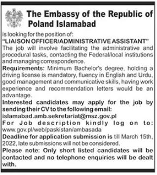 The Embassy of the Republic of Poland Islamabad, Embassy invites applications for job positions advertised in daily The News dated 19 February 2022 for following vacancies in Islamabad, islamabad Islamabad Pakistan.