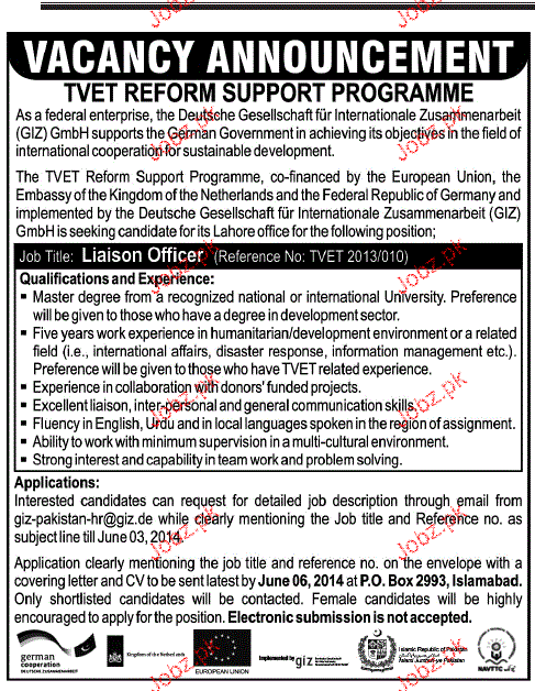 Apply as per details in job advertisement. Login to view further details of how to apply via https://www.jobz.pk online.