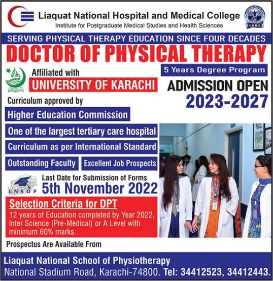 Admissions in Liaquat National Hospital and Medical College 2022 for Doctor of Physical Therapy 5 Years Degree Program. has been announced. Students can enroll for admissions in Liaquat National Hospital and Medical College Karachi Sindh Pakistan for academic year 2022 to continue campus based or online education in Medical College. Students who want to enroll for academic session 2022 in DPT qualification and admission criteria for Private institute can apply till last date 5 November 2022. Read newspaper ad for exact details.