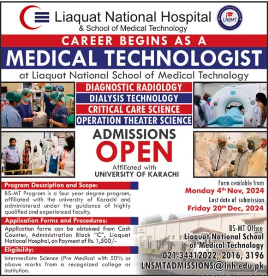 Liaquat National Hospital & Medical College Diploma Courses of Diagnostic Radiology, Dialysis Technology, Critical Care Science, Operation Theater Science admissions 2024 has been started. Students can enroll for admissions in Liaquat National Hospital & Medical College Karachi Sindh Pakistan for academic year 2024 to continue campus based or online education in Medical Medical College. Eligible candidates for admissions in Diploma and BS can apply as per Government institute criteria and before closing date 19 December 2024 after reading advertisement online. Read newspaper ad for exact details.
