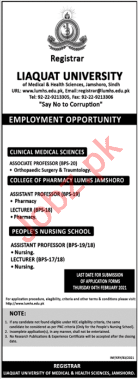 Liaquat University of Medical & Health Sciences LUMHS Jamshoro, Government of the Sindh is looking for the services from energetic candidates for the posts of Professor, Associate Professor, Assistant Professor, Lecturer, Professor Clinical Medical Sciences, Assistant Professor Pharmacy, Assistant Professor Nursing.