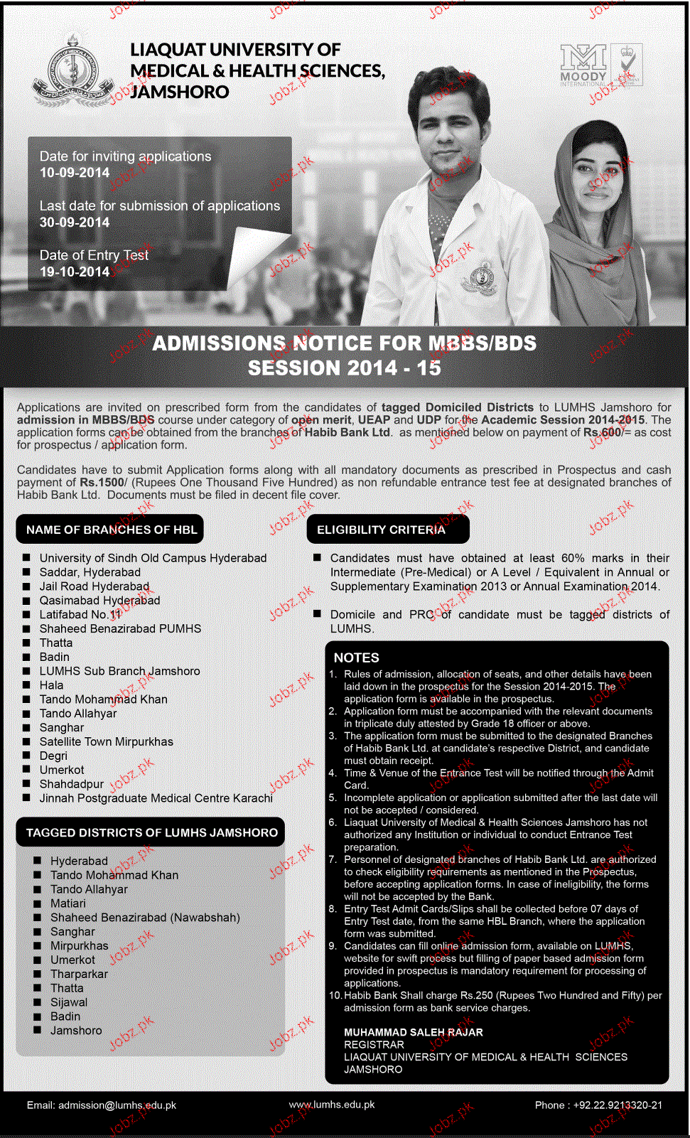 Liaquat University of Medical & Health Science Admission in MBBA and BDS in Jamshoro. Read newspaper ad for exact details.