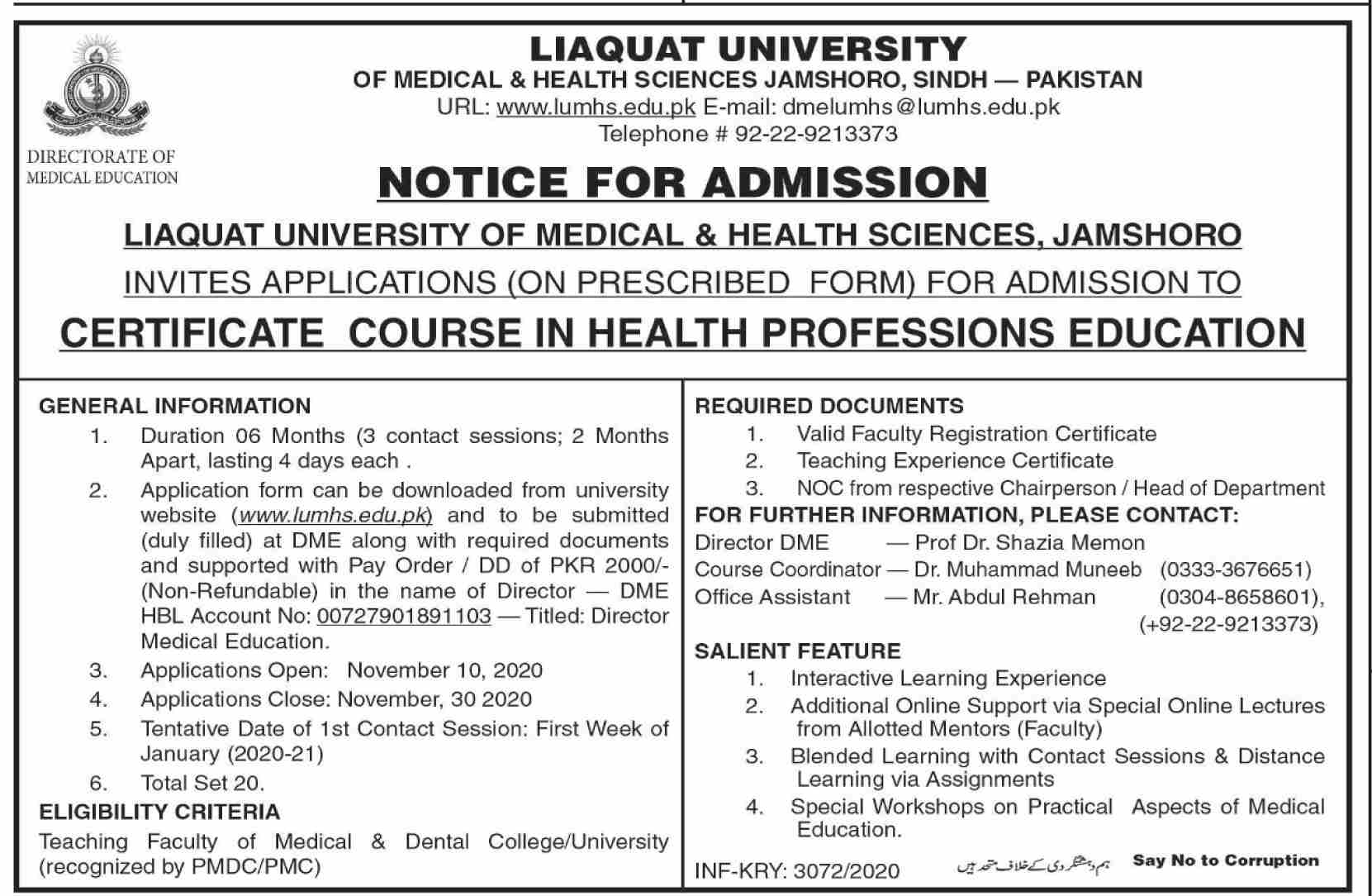 Liaquat University of Medical & Health Sciences LUMHS invites online applications for admissions for Certificate Course in Health Professions Education in Jamshoro Sindh Pakistan. Read newspaper ad for exact details.