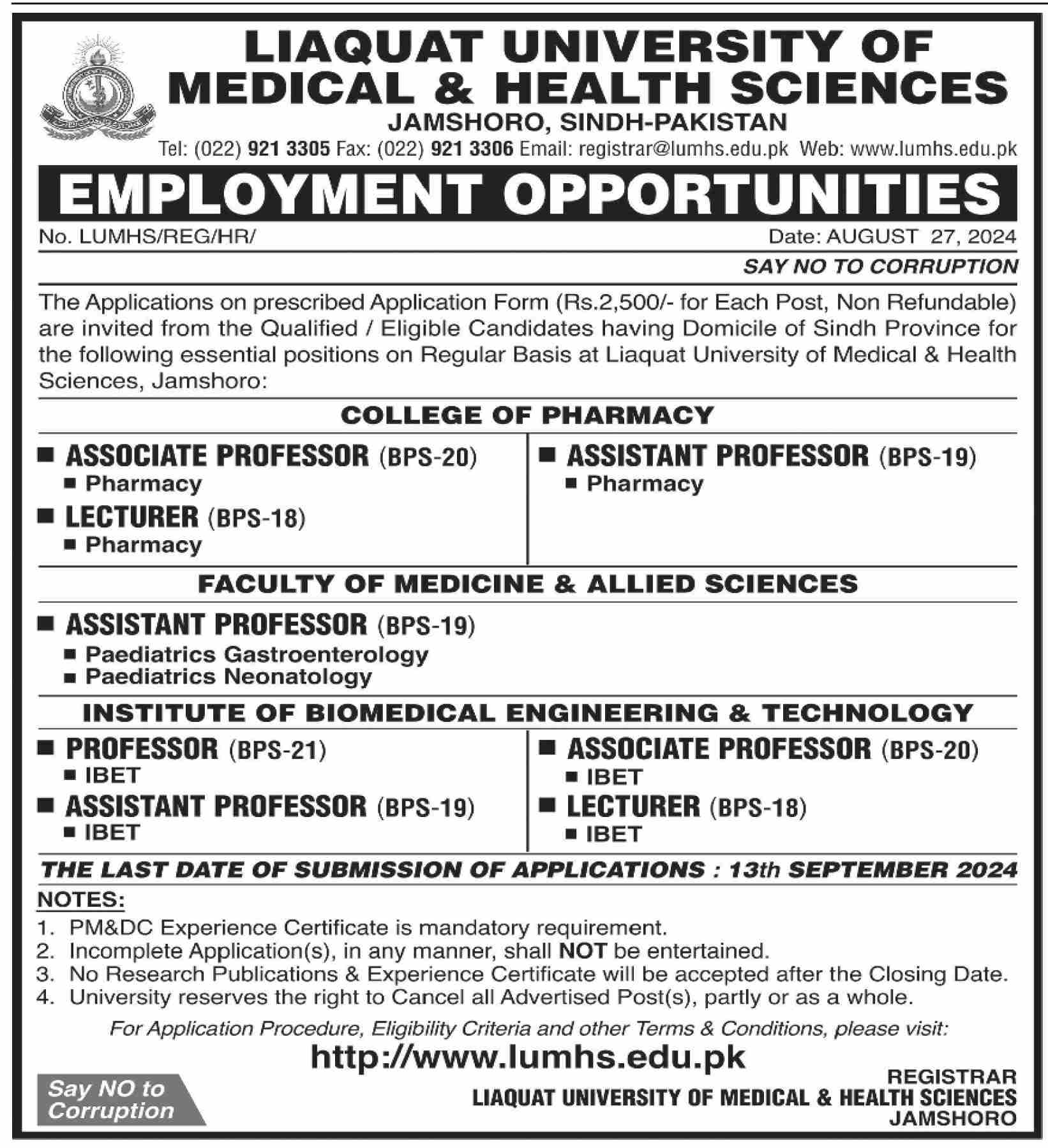 Vacancies in Liaquat University of Medical & Health Sciences Advertisement August 2024