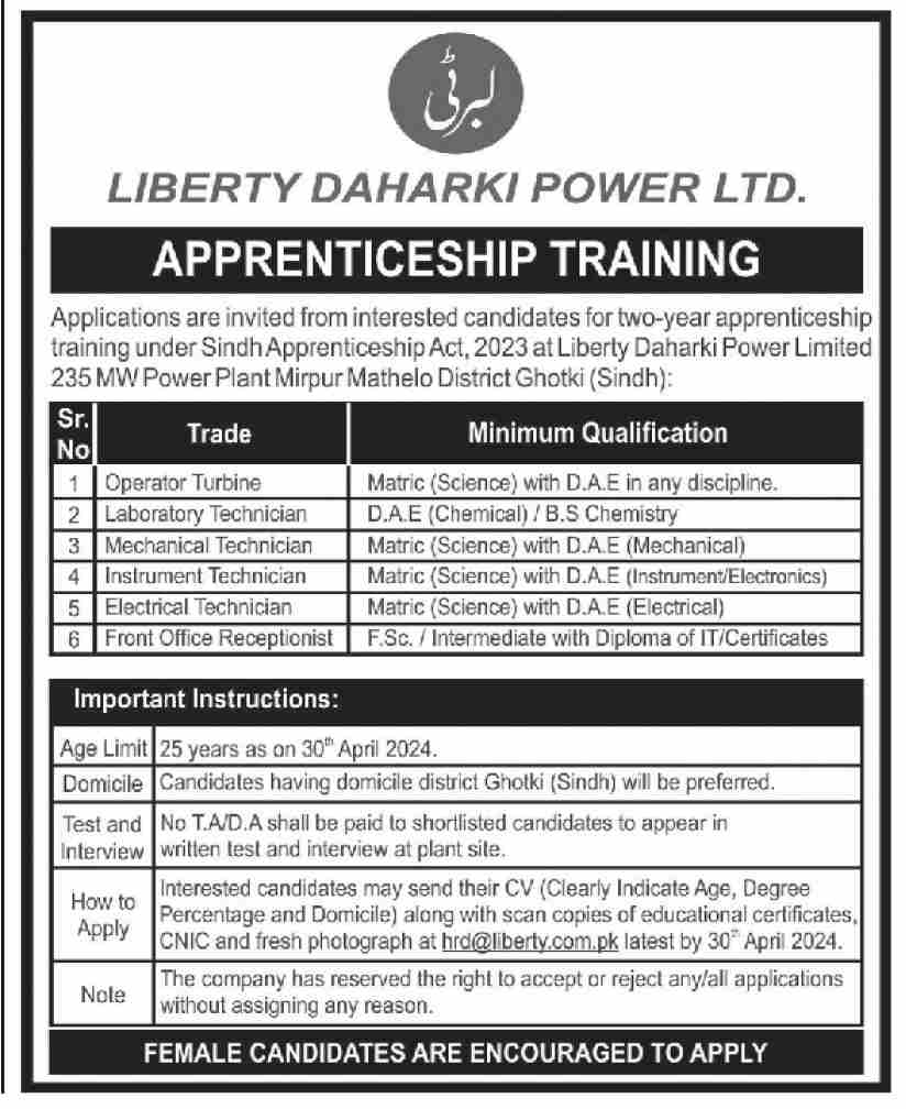 Vacant posts including mechanical technician, laboratory technician, front office receptionist, instrument technician, operator turbine and electrical technician are announced in Liberty Daharki Power Limited Ghotki, ghotki Sindh Pakistan as per 14 April 2024 advertisement in daily Jang Newspaper. Matric, DAE and Intermediate etc. educational qualification will be preferred.