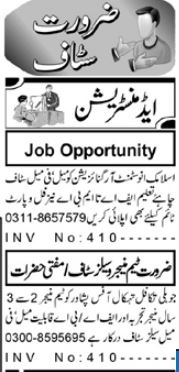 Private Organization Peshawar, peshawar Khyber Pakhtunkhwa KPK Pakistan invites applications from eligible candidates for the post of video editor, graphic designer, librarian and marketing staff as per advertisement of July 19, 2022 published in daily Mashriq Newspaper. Persons with Intermediate and Bachelor etc. education can apply.