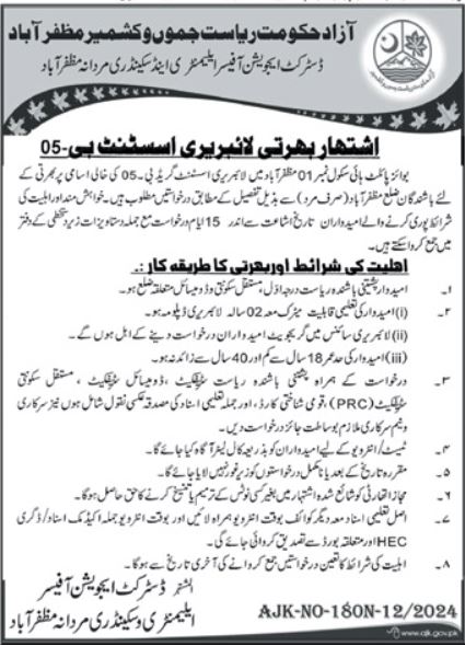 District Education Office, Elementary and Secondary Education Department ESED Muzaffarabad, muzaffarabad AJK Pakistan invites applications from eligible candidates for the post of library assistant as per advertisement of December 19, 2024 published in daily Khabrain Newspaper. Educational qualifications required Matric etc.