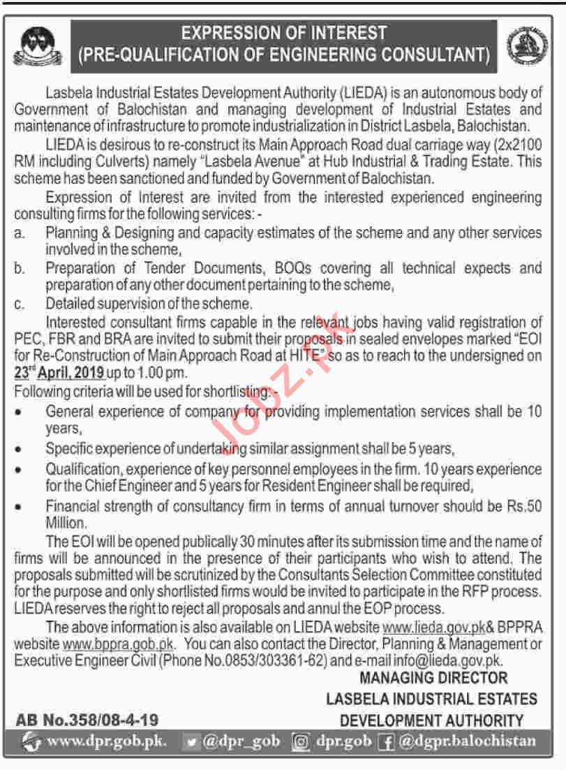 Vacancies in Lasbela Industrial Estate Development Authority LIEDA Advertisement April 2019
