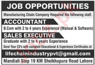 Vacant posts including sales executive and accountant are announced in Life Chain Industry Pvt Ltd Sheikhupura Road Lahore, lahore Punjab Pakistan as per 13 April 2025 advertisement in daily Jang Newspaper. Preferred Education is Master, Bachelor and MS etc.