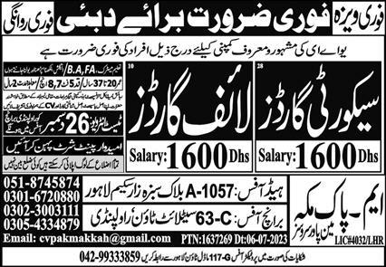 Vacant posts including lifeguard and security guard are announced in M Pak Makkah Manpower Services Dubai, abu dhabi Dubai as per 22 December 2023 advertisement in daily Express Newspaper. Persons with Intermediate, Bachelor and BA etc. education can apply.