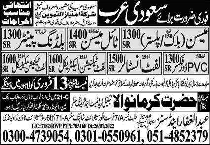 Abdul Ghaffar & Sons Jeddah Saudi Arabia invites applications from eligible candidates for the post of plaster mason, lift installer, pvc door fixer, lift technician electrical, mason, lift technician mechanical, mason tile, building painter and block mason as per advertisement of February 11, 2022 published in daily Express Newspaper. Educational qualifications required Middle, Matric and Intermediate etc.