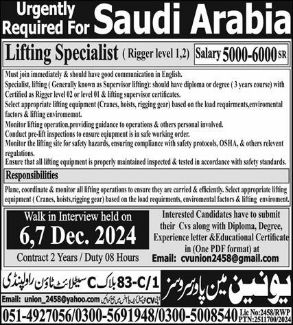 Union Manpower Services Riyadh, riyadh Saudi Arabia invites applications from eligible candidates for the post of lifting specialist as per advertisement of December 4, 2024 published in daily Express Newspaper. Educational qualifications required Bachelor and Intermediate etc.