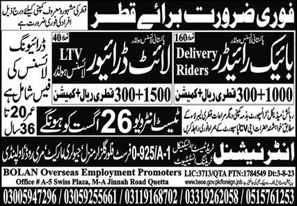 International Trade Test & Training Center jobs advertisement dated about 23 August 2023 in daily Express Newspaper invites application for the vacant post of bike rider, ltv driver, light driver, delivery rider and driver in Qatar, qatar Qatar. Candidates with Matric and Intermediate etc. educational background will be preferred.