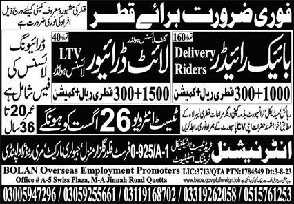 International Trade Test & Training Center Qatar, qatar Qatar invites applications from eligible candidates for the post of ltv driver, driver, delivery rider, light driver and bike rider as per advertisement of August 24, 2023 published in daily Express Newspaper. Candidates with Matric and Intermediate etc. educational background will be preferred.