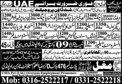 CMA Pvt Ltd invites applications for job positions advertised in daily Express dated 4 October 2023 for following vacancies in Abu Dhabi, sharjah UAE.