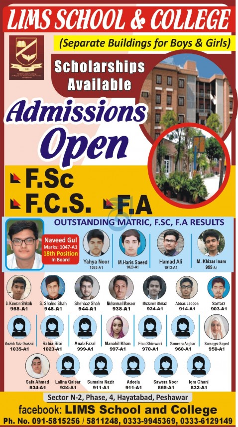 LIMS School And College is offering admissions for Intermediate, FA, FSc Pre Engineering, FSc Pre Medical and FSc Computer Science in Peshawar Khyber Pakhtunkhwa KPK. Read newspaper ad for exact details.