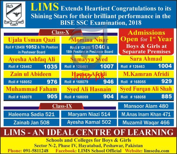LIMS Schools adn Colleges For Boys & Girls Admission in Class XI FSc Pre Medical, Pre Engineering and Computer Sciences in Peshawr and Nowshera. Admission Open for Both Male / Female Students. Read newspaper ad for exact details.