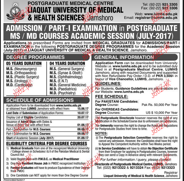 Liqauat University of Medical and Health Sciences Admission in MS / MD in Jamshoro. Read newspaper ad for exact details.
