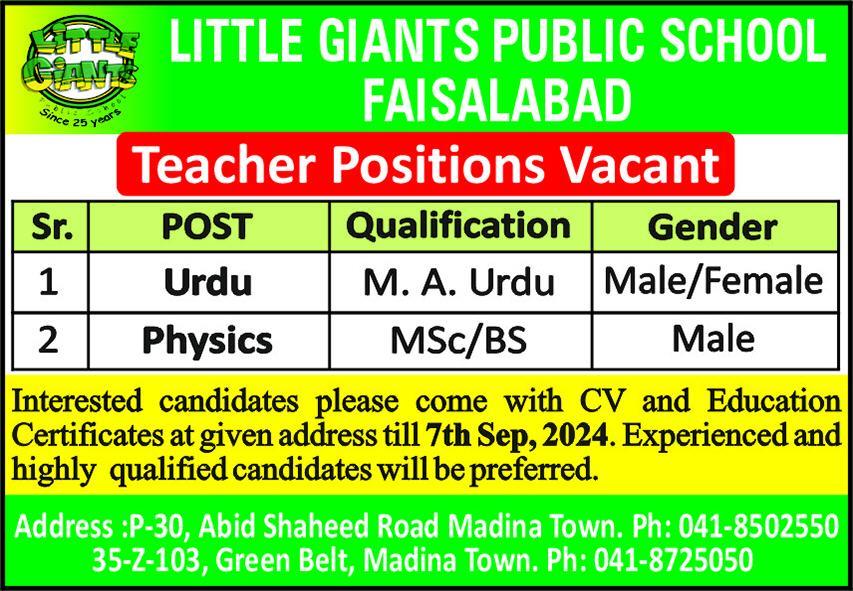 Latest Little Giants Public School Teaching Posts Faisalabad 2025