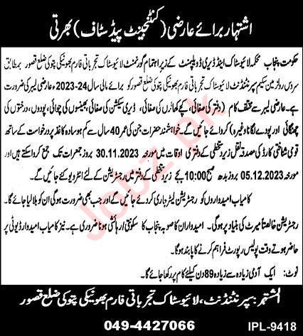 Vacant posts including contingent paid staff and labor are announced in Live Stock and Diary Development Kasur, kasur Punjab Pakistan as per 12 November 2023 advertisement in daily Express Newspaper. Preferred Education is Primary, Middle and Matric etc.