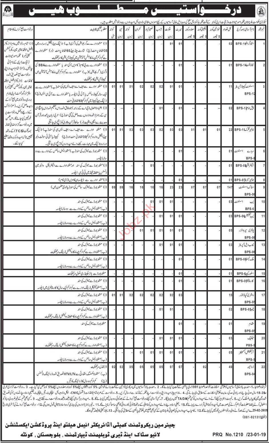 Livestock & Dairy Development, Animal Health & Protection Extension is looking for Stenographer, Accountant, Assistant Computer Operator, Pesh Imam, Clerk, Survey Assistant, Electrician, Auditor, Stock Assistant, Lab Assistant, Lab Technician, Poultry Supervisor, Tube Well Operator, Milk Tester, Store Keeper, Carpenter, Veterinary Compounder, Plumber, Mechanic, Driver, Artificial Inseminator in Quetta.