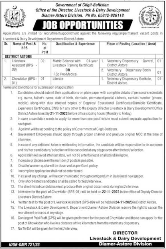 Livestock & Dairy Development Department Astore, astore and gilgit Gilgit Baltistan Pakistan invites applications from eligible candidates for the post of chowkidar and livestock assistant as per advertisement of November 8, 2023 published in daily K2 Newspaper. Educational qualifications required Matric and Intermediate etc.