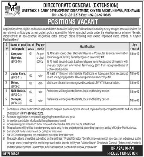 Directorate General of Livestock & Dairy Development Department Peshawar Khyber Pakhtunkhwa KPK Pakistan invites applications from eligible candidates for the post of driver, clerk, naib qasid, sweeper and computer operator as per advertisement of January 15, 2022 published in daily The News Newspaper. Candidates with Intermediate, Matric, Middle and Bachelor etc. educational background will be preferred.