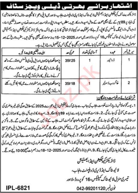 Livestock & Dairy Development Department jobs advertisement dated about 30 November 2025 in daily Jang Newspaper invites application for the vacant post of khakrob, driver and sweeper in Lahore, lahore Punjab Pakistan. Preferred Education is Matric and Middle etc.