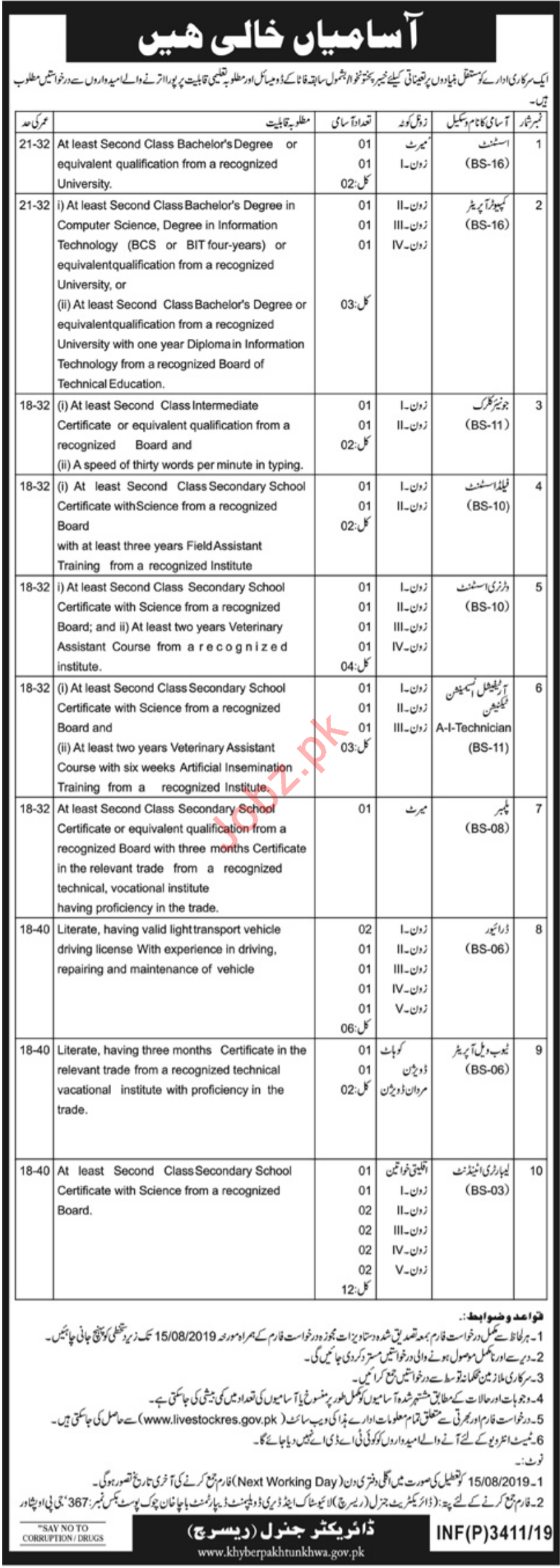 Qualified and technical personnel for the positions of Assistant, Computer Operator, Clerk, Field Assistant, Veterinary Assistant, AI Technician, Plumber, Driver, Tube Well Operator & Laboratory Attendant required for Livestock & Dairy Development Department in Peshawar KPK 2019.