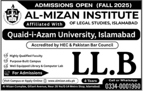 Al Mizan Foundation has announced admissions 2025 for llb. Eligible students can apply for academic admissions 2025 in Al Mizan Foundation Islamabad Islamabad Pakistan for Science College. Students for admissions in & criteria can apply as per Government institute admission policy 2025 before closing date as per advertisement. Read newspaper ad for exact details.