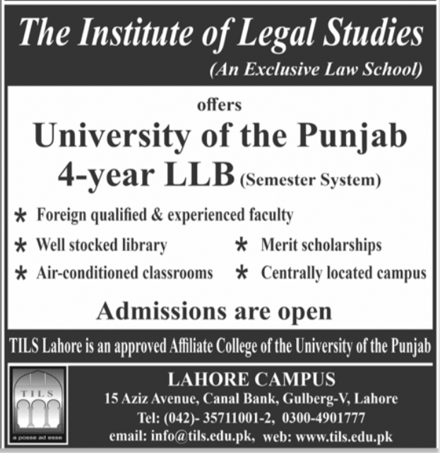 The Institute of Legal Studies TILS llb admissions 2025 has been started. Eligible students can apply for academic admissions 2025 in The Institute of Legal Studies TILS Lahore Punjab Pakistan for Science College. Students for admissions in & criteria can apply as per Government institute admission policy 2025 before closing date as per advertisement. Read newspaper ad for exact details.