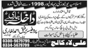 Ali Law College LLB admissions 2025 has been started. Students can enroll for admissions in Ali Law College Bahawalnagar Bahawalpur Punjab Pakistan for academic year 2025 to continue campus based or online education in Law University. Students for admissions in can apply for online or campus classes as per Private institute criteria till admission closing date March 31, 2025. Read newspaper ad for exact details.