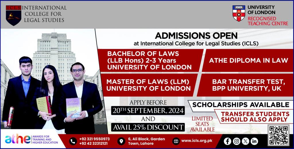 International College for Legal Studies ICLS has announced admissions 2024 for LLB, LLM. Students can enroll for admissions in International College for Legal Studies ICLS Lahore Punjab Pakistan for academic year 2024 to continue campus based or online education in Law University. Students who want to enroll for academic session 2024 in LLb and LLM qualification and admission criteria for Private institute can apply till last date 20 September 2024. Read newspaper ad for exact details.